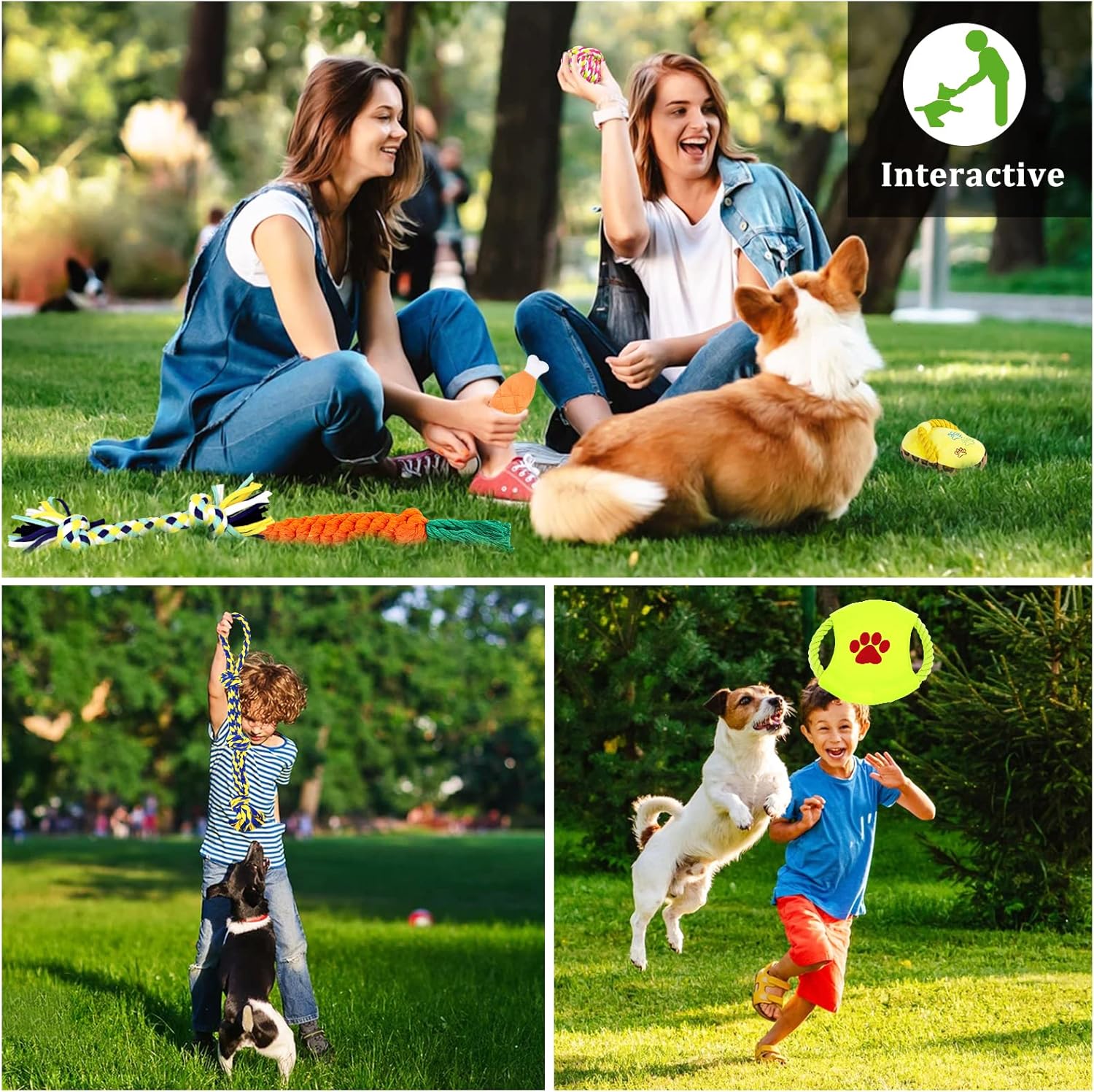 Most Popular Dog Toys Chew Toys Our variety of dog toys are made of 100% natural cotton rope and rubber, good bite resistance, non-toxic, odorless, washable, harmless and safe, and are not easily damaged by dogs. . . 20 Pieces Interactive Pet Rope Toy This set contains 20 toys in total, which include a chew rope knot, a rope ball, a flying disc, a dumbbell, a carrot, slippers and toys with avocado sound. These puppy toy rope and ball sets can easily stimulate interest in dogs and reduce loneliness and boredom. Teeth Cleaning Use dog toy accessories to clean their teeth, remove stains and reduce tartar. Puppies can chew the rope toy to reduce swelling and pain during tooth development. Protect the health of your pet’s teeth. The interactive dog chew toy keeps dogs in good physical and mental shape. Increase your dog’s mental performance and avoid boredom, furniture damage and overeating. Perfect for interacting with your dog and improving relationships with pets. 100% Our 20-piece sets vary in size, making them very suitable for pets of different sizes.